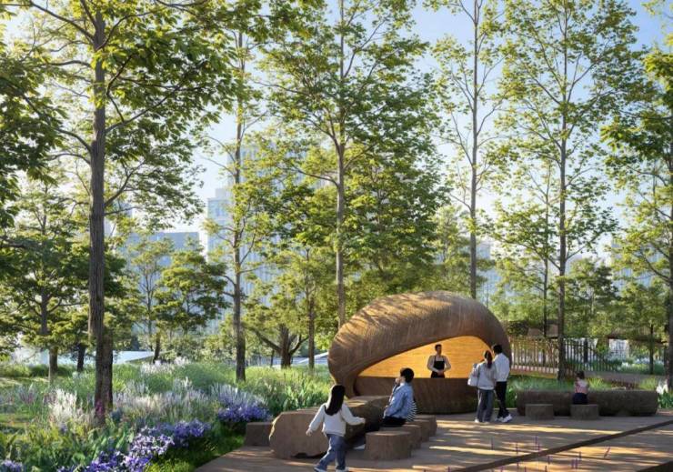 走马塘市政公园:项目北侧超10万方市政滨水公园,露营湿地、亲子沙洲、溪流剧场、雕塑草坪等五大主题。