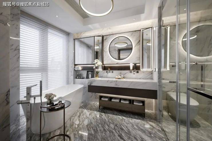 威乃达、SMEG、铂浪高、卡德维、Miele等一众比肩上海顶级豪宅的国际厨卫标准先不说,此处只讲两个细节:踢脚线是金属包边的;卫生间连墙壁也是整面石材。