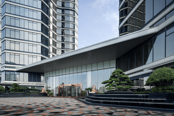 建筑以杭州市花~桂花花瓣为造型灵感,四瓣依次展开,以同频世界审美的曲线立面,融合鎏金玻璃幕墙,让建筑在钱塘江畔熠熠生辉,构建脱颖而出的世纪城新地标。