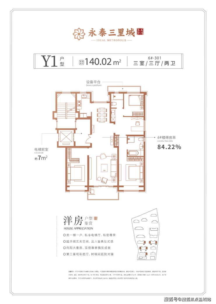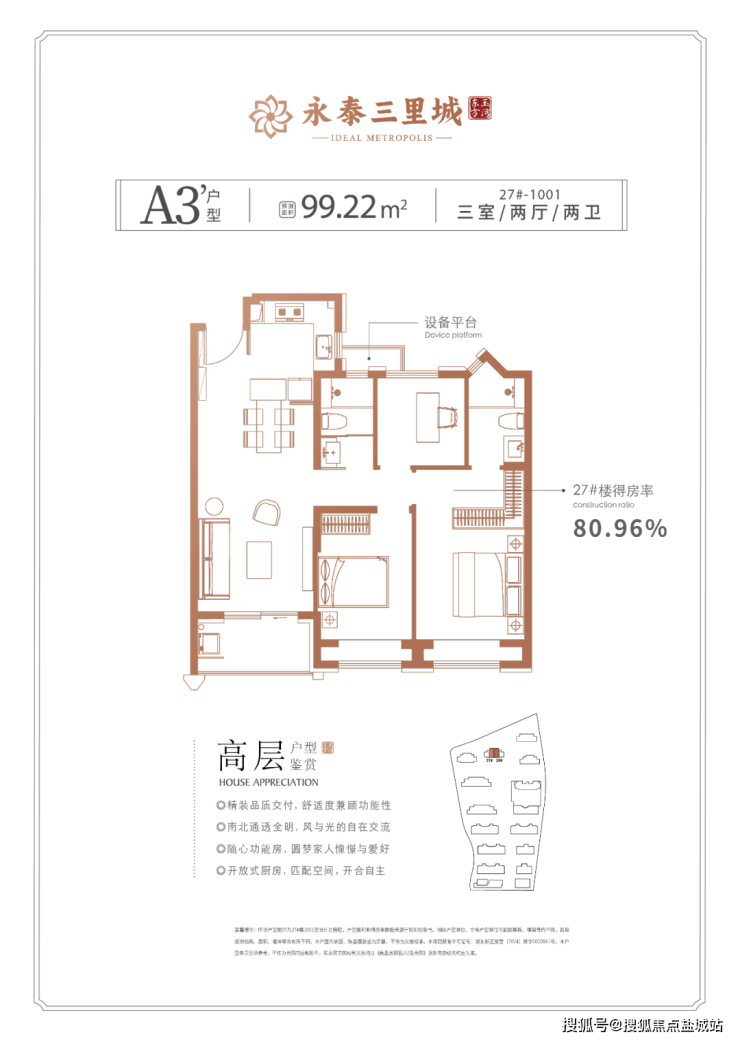 这3个户型三开间朝南、室内“朝南2飘窗+1阳台”、再加上“2卫”、“动静分离”的设计,不管是采光、视野、通风、私密性,还是实用性都十分出色。