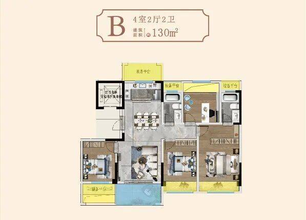 筑面积约130㎡的户型适合改善人群上车,设计了四室两厅两卫,有着宽阔的室内空间,功能区分明显。