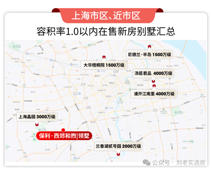 再来看上海目前在售的新房,容积率低于1.0的项目,仅有寥寥十几盘而已,而近市区的低密别墅总价1500万起步,动辄上4000万。