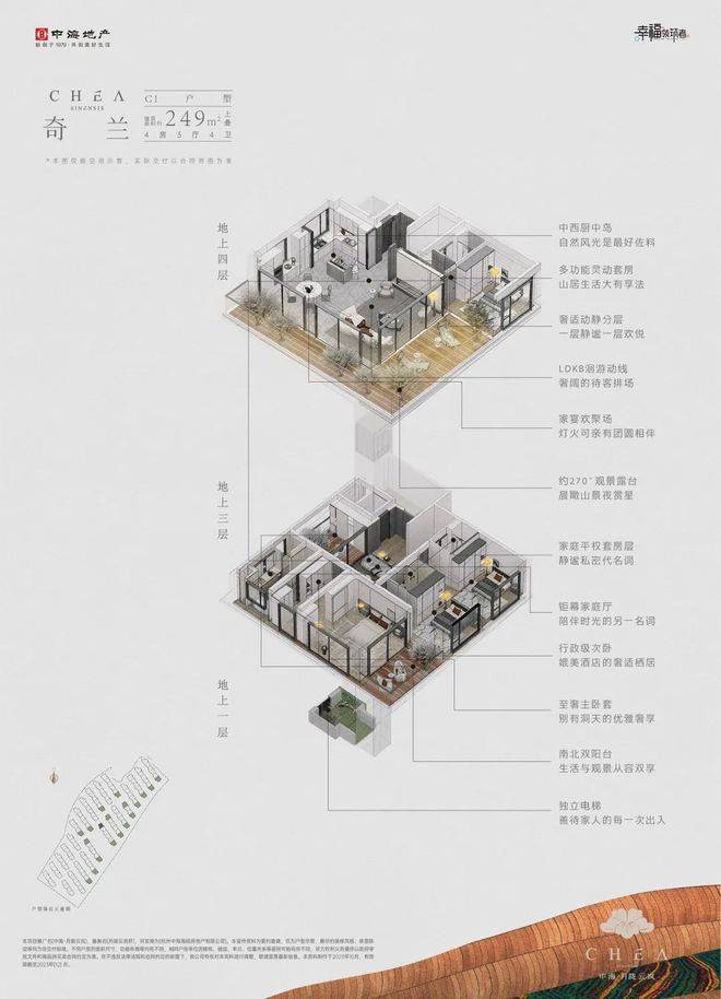 以建面约210㎡的上叠“云雾”和建面约221㎡的下叠“旗枪”为例。月陇云岚解决了很多叠院上下叠共用电梯这个痛点,在这个项目里,所有的户型都是私梯入户的。下叠入户口在南向花园,上叠在一楼也有北向私梯入户花园空间。