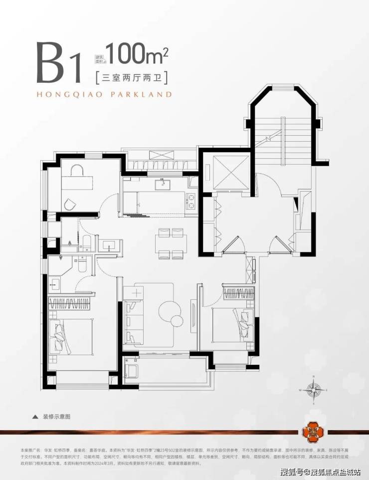 B1户型建面约100㎡,三开间朝南的设计,提高了采光的效率。