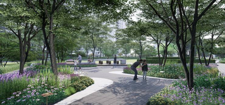 约4000㎡森林光影会客厅,以特色种植、对景景墙、植物认知花园、会客廊架、户外阅读、休闲平台6大主题为主,打造围合式社区精神核。同时与架空层联动,形成多功能空间场域,满足邻里会客、休憩、观景需求。
