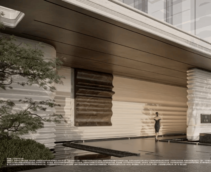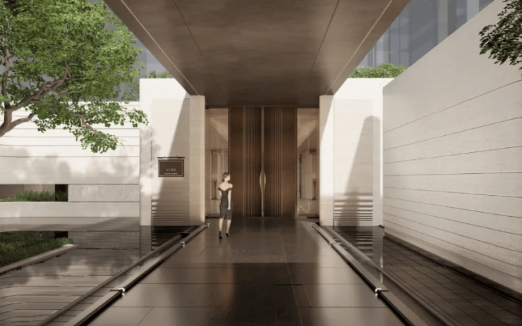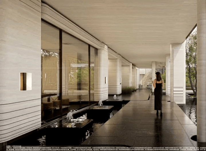 伴水归家,羽毛枫四时变幻的叶色,提醒每一位归家者:踏入此门,便是告别喧嚣,回归内心的静谧与从容。约5米宽的流光回廊,打造无风雨归家体系,以香槟铝板为顶、辅以黄金比例柱列,涌泉水钵,展现了【水】的不同表现形式。