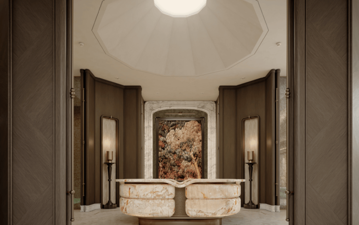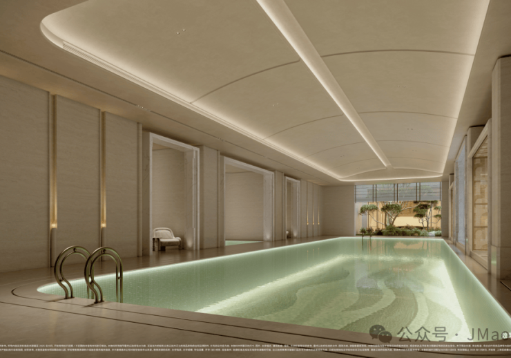 栖境泳池,曲线穹顶、奢石立面和下沉庭院景致相融,天光经采光井漫洒,云影徘徊。
