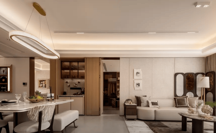 在光影方面,水景的无界渗透,天然倒映阳光,自然光线于社区之内,无界穿梭,打造了一个玲珑光境。细节处,壹江臻邸更是点缀了精致的造型灯,朦胧的光蕴氛围,犹抱琵琶半遮面的美感;独特的造型,更有“焕炳若列星而盈室”的美感。