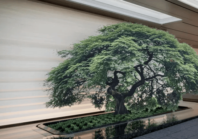 而在归家之路上,【水】的元素,随处可见。门头的安哥拉黑光面花岗岩上,点缀迎宾水景,造型羽毛枫伫立于前,春嫩、夏翠、秋绯,立于门口,是一场东方待客之道的隐喻: