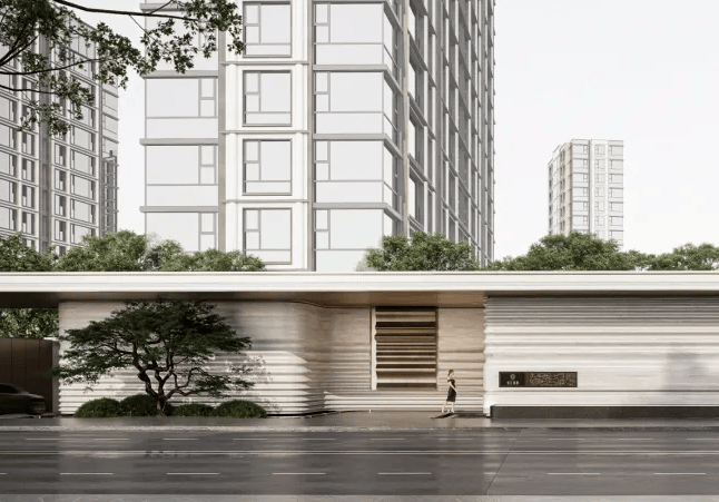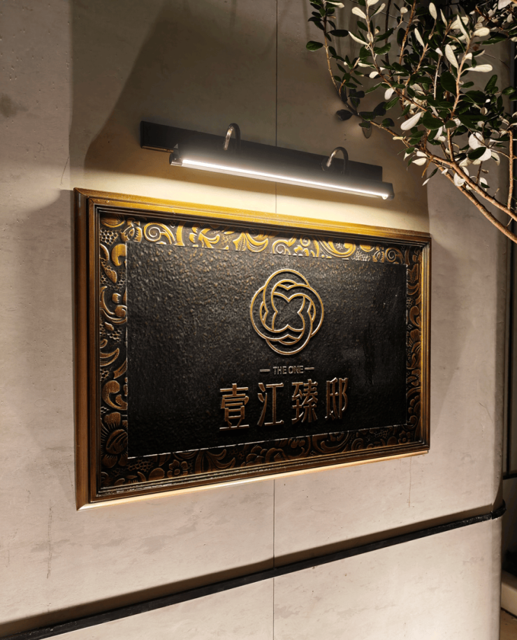 超尺度的城市界面,就像一座艺术长廊,来往行人,步行至小区转角处,就能看到奢石打底的景墙上,壹江臻邸的logo镶嵌其中,一股昭示感,于此爆发!