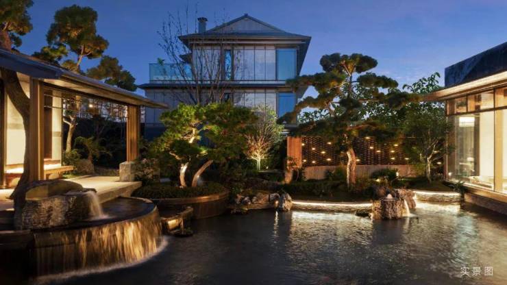 以现代技法的精简流畅,展现传统建筑的文化精髓。大面积玻璃局部点缀奢石,流露古朴隐奢的东方气韵,更彰显居者的广阔襟怀。