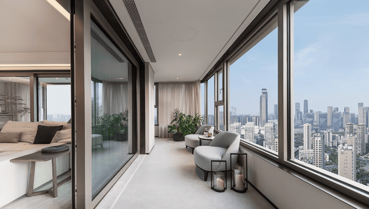 在产品力内卷到白热化的杭州,棠前明月卯足了力气,秉承只定制不复制的初心,从建筑立面,到公区,再到室内,将改善级产品的“豪宅图腾”集于一身:鎏金线条勾勒奢雅摩登的银色铝板,搭配大面积曲面玻璃,打造一体成型的超流体建筑立面,边套奢享IMAX弧形景观窗,带来约270度天幕视野。