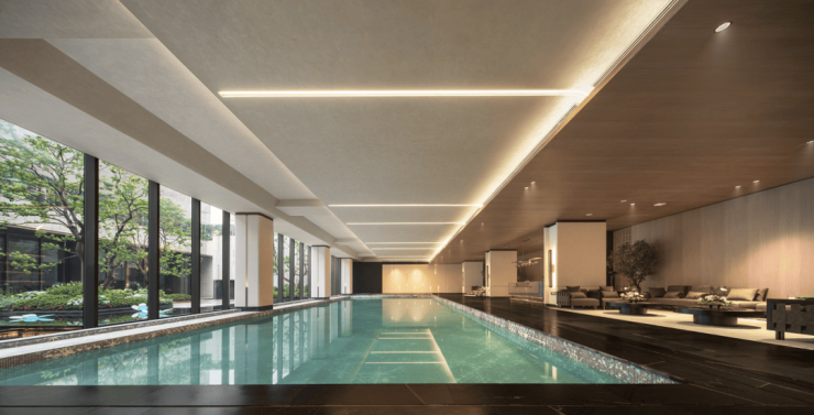 会所内还包含了室内恒温泳池、健身房、瑜伽房、中央洽谈区及儿童游乐区等休闲运动空间,大大扩充了业主的生活半径。