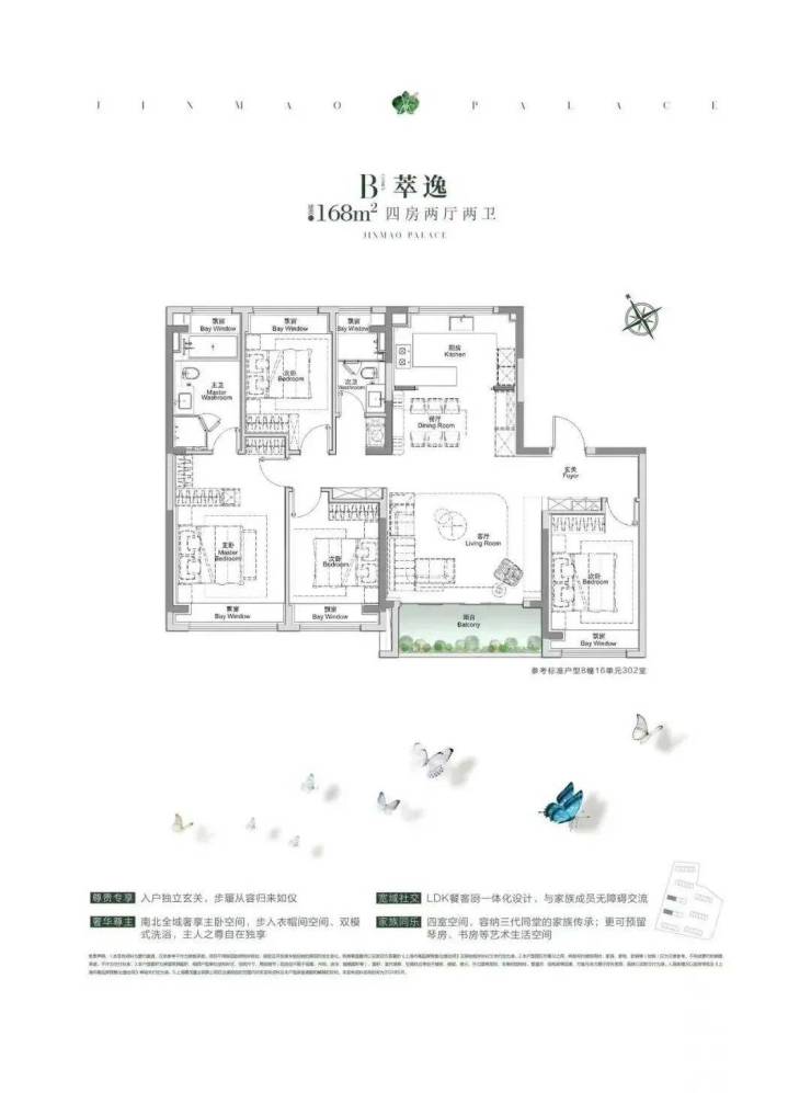 四开间朝南的设计,户型方正、标准的南北通透设计;阳台+客餐厅+厨房一线相连,整个户型的采光通透度、通风都非常出众。4房6飘窗1阳台的设计,各个功能间面积分配合理,可以说是上海千万级置业的优选!