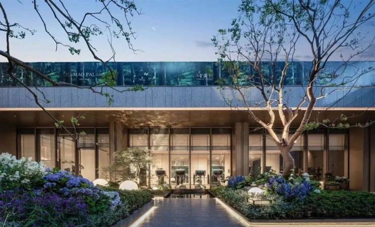 金茂府3.0系“自然生长的社区”为主旨,会所中央打造了下沉式水光庭院,与周边建筑融为一体,原石墙面和乌桕打造的自然盆景穿插其中,夜幕降临,天光、水光、灯光交相辉映,呈现出浪漫恬静的自然景观氛围。