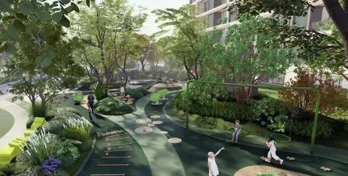 中环金茂府考虑到社区社交功能属性,在部分栋楼设计了架空层,为全龄人群提供更丰富的社交休闲运动空间,家里老人和孩子不出社区就可以散步和玩乐,不仅体现社区功能丰富性,更能保障家人安全。
