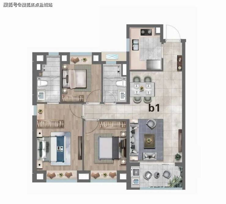 其中,建面约104㎡三房两厅两卫 ,三开间朝南+全卧室带飘窗+动静分离+南北通透+主卧套房设计,功能性和空间感完美结合,采光面非常足。