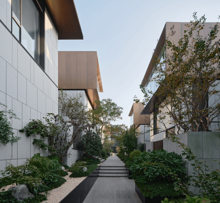 单元之间交错嵌合,将公共通道与私密庭院相连接,形成“口袋花园”,在视觉上相互渗透,无需额外用地便可扩展体验边界,让空间流动通透,尺度与体验真正回归人本身。