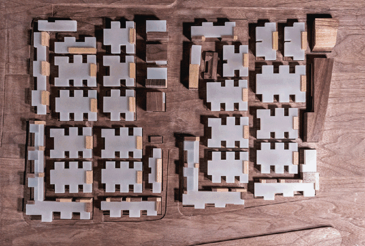 场地由南北两地块组成,被城市支路分隔。根据1.4的容积率需求,我们先在用地范围内划出30-40米的“网络骨架”,对应“主弄-支巷-口袋节点”三级公共层次。整体布局以外界面连续围合、内部组团私密性为基础。根据户型需求,进一步设计了半围合式“L”型单元模块,填充入场地内部,拼合形成“T”“工”“王”等不同形态。