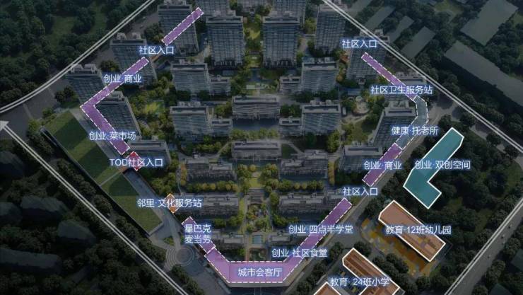 社区底层外围布置菜场、特色店铺、幼教中心、养老机构、创业支持等社区及城市公共服务功能,使城市的生活属性与便利特性得以在社区外围充分实现。