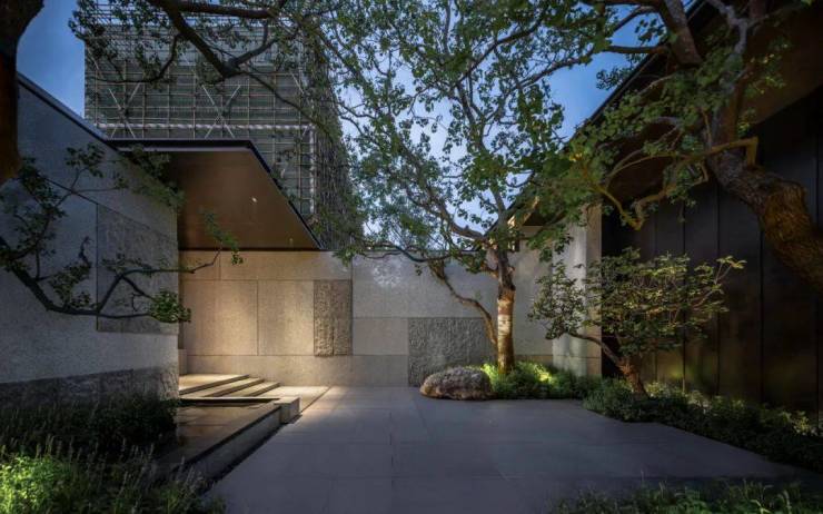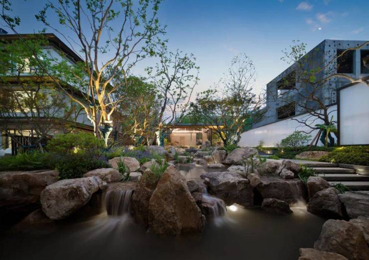北区配备约3000㎡酒店式会所花园,地下会所承载艺术展示与社交功能;南区通过自然山水的礼序山石园林步入约1500㎡地上泛会所花园区。设计汲取古代文人雅士隐逸山林的空间意象,融入山、泉、林、台、石等元素,巧妙结合书院文化内涵与自然意境,营造富有东方哲思的景观体验。