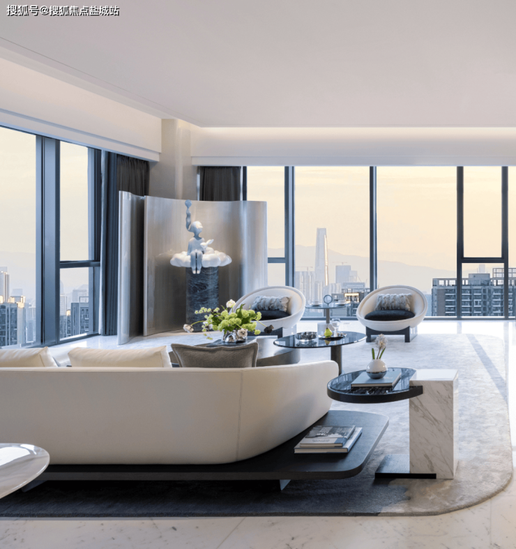 室内空间美学的营造,需要一个更大的公区。认真观察邱德光最新的作品,都有把公区越做越大的趋势。就像前湾·归源,整个公区面积足足有约122㎡,再加上约3.8米的层高,有着「海阔天空」的辽阔感。