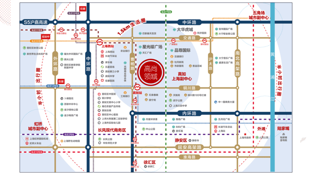 “高·尚领域”位于曹杨路1518号。项目南接铜川路,西临曹杨路,北衔星光耀广场和广至路,东接真华南路。项目共有4个版块,呈“田”字型分布,礼泉路和礼尚路十字交叉贯穿整个项目。写字楼位于曹杨路与铜川路的东北方向,与中海环宇荟只有一路之隔。车行入口位于礼尚路。