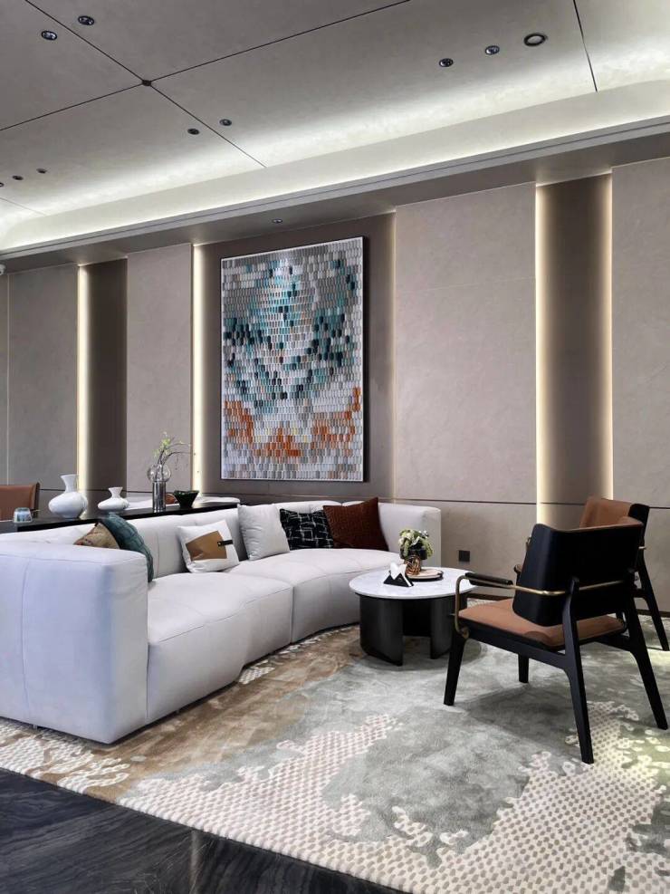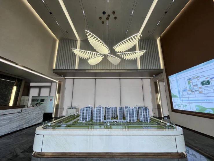 沙盘区域上空,巨型灯饰如花绽放,彰显出一种灵动的华丽,寓意「三花」盛放造极滨海。漫步行移,视觉延伸至沙盘户模区巨幅面宽落地玻璃,连通室内外景观,营造出置身于自然间的松弛体验,仿佛在江风吟咏间,风雅际会,兑现理想生活向往。