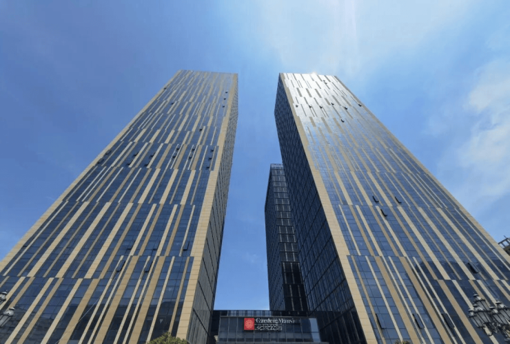 项目由AB两栋双子大厦组成。总建筑面积约28000㎡,每栋大厦高30层,共计116户,均为240㎡瞰景大平层。作为地标性建筑,建筑天际线恢宏大气,项目的外立面均采用玻璃幕墙+保温一体板+铝板线条构成,极具高级现代感。