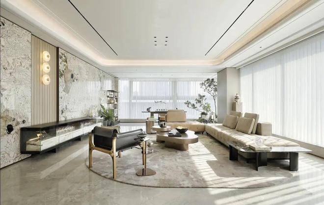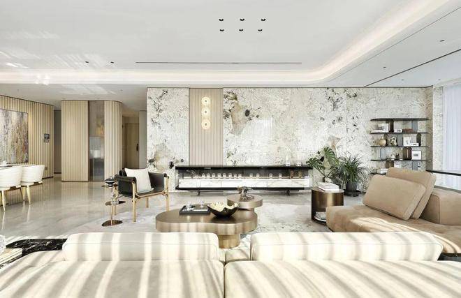 而李嘉诚御用设计师梁景华的390m²正厅,电视背景墙是意大利潘多拉奢石,甚至延伸到了空中花园,像是飞舞在皑皑雪山中的霓虹霞衣,在皓白的雪花上勾勒出写意的纹理,灿若繁星。