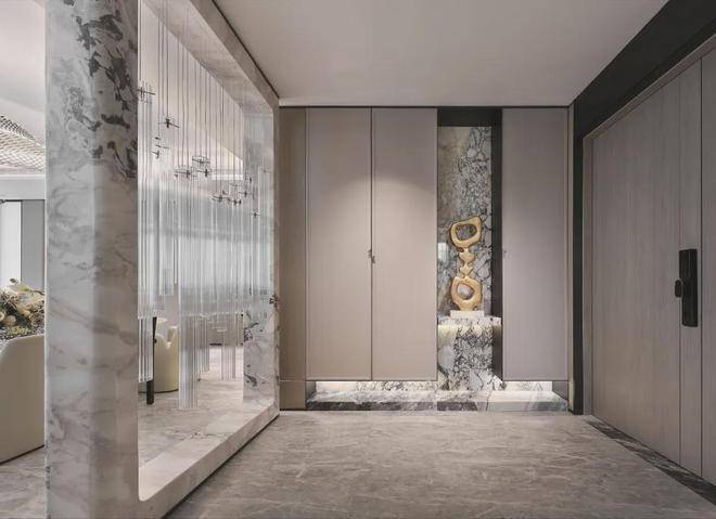户型格局上,基本做成了类一梯一户格局,一层两户两部电梯,彼此都拥有独立的入户门厅。进门是大空间玄关区,与之搭配的辅料,有皮革、山水纹理大理石、瓦楞玻璃、仿古铜金属等,时而明澈,时而苍劲。米白色石材和温润的木质面犹如一个盛载东方意蕴的艺术品。