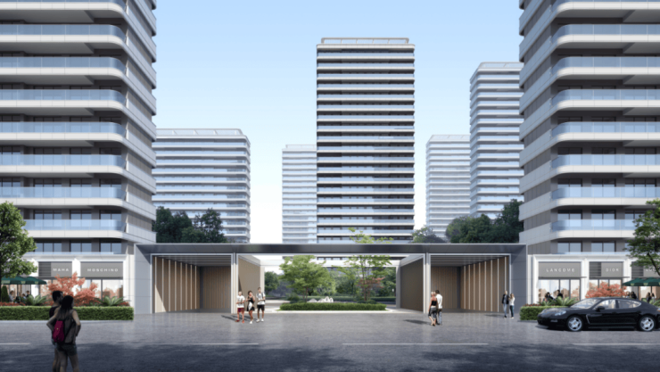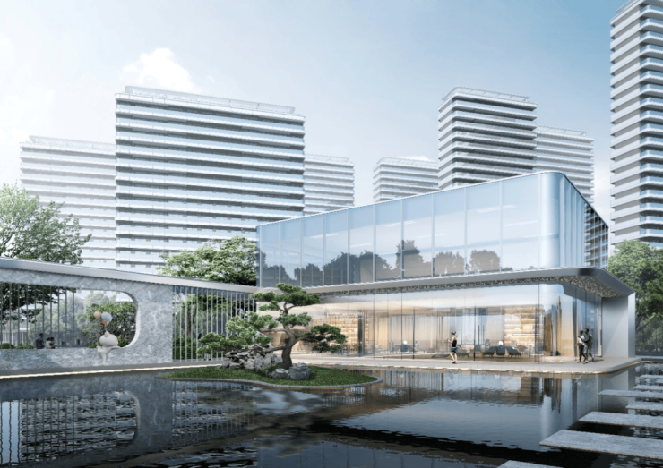 园区西侧入口大堂以6米高的建筑体量,辅以玻璃外饰面设计,营造出明亮通透的迎宾空间。入口处约30米宽的雨棚造型,展现出宏伟气势,结合前庭水景,打造出充满仪式感的归家界面。