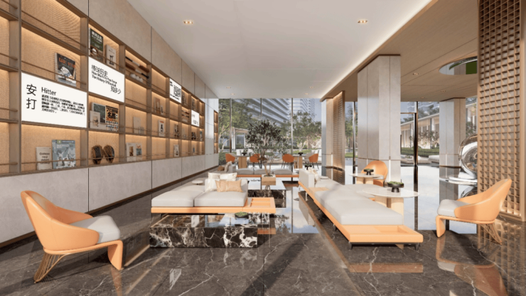 作为城市到小区和过渡空间,项目将园区大堂打造成社区共享的城市客厅空间,大面原木色饰面,多组舒适的沙发、桌椅,打造轻松融洽的交流氛围。