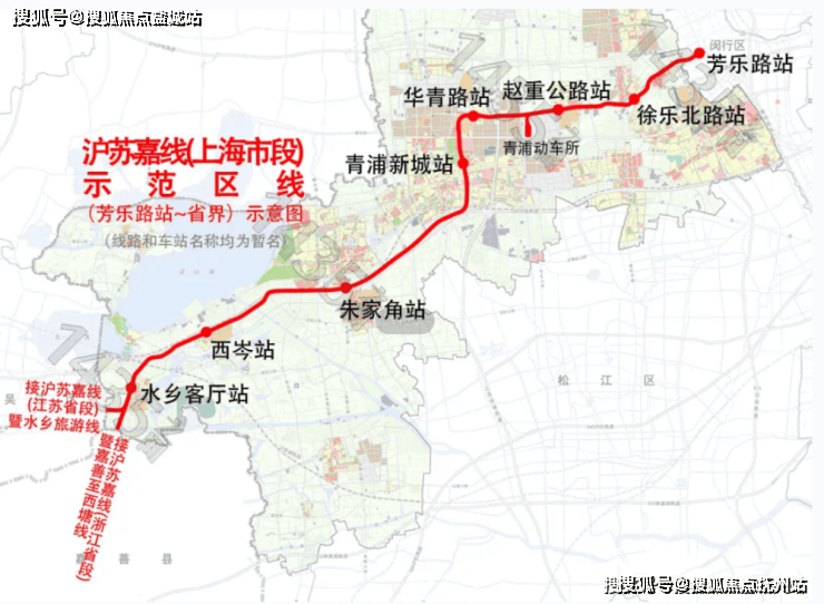 示范区线西起水乡客厅站,东至虹桥站,沿沪青平路-沪渝高速-外青松公路-北青公路布线行走。