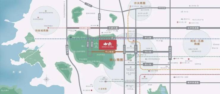 🌻山云庭项目位于新区华山路与龙池路交汇处。距离狮山核心约5-6公里,何山隧道已通车,车行10分钟以内可直达绿宝、天街新区核心,畅享顶级城市配套。