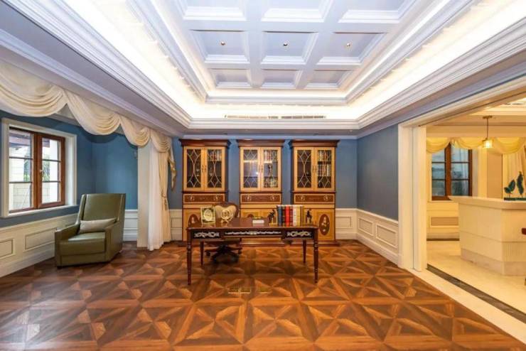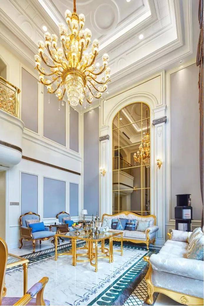 一楼客厅约7.2米挑高设计,恢弘大气。大理石拼花地面精美奢华,超大艺术装饰镜别具一格,优雅的欧式线条与雕花随处可见,整个空间呈现出高贵华丽的格调。