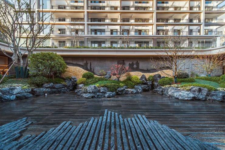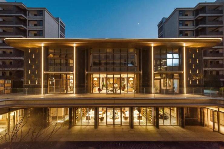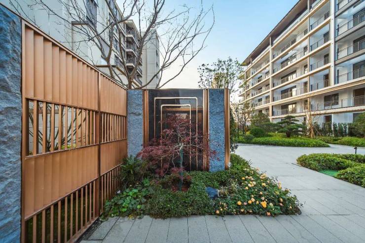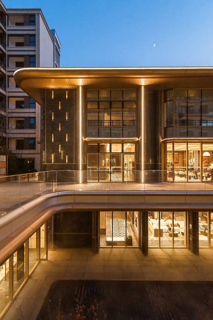 建筑立面上,米白色石材、咖色真石漆与香槟色铝板的搭配,在阳光下呈现出内敛而高级的质感,带来现代东方的美学形象。