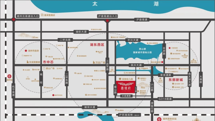 嘉境府位于湖州东部新城核芯区块,奢享西山漾城市湿地公园生态资源,一揽约500亩青翠山林与约1500亩湿地水域,为城市高阶人士匹配难得的诗意栖居环境。不仅如此,项目择址融汇人文、科教、商业,3大核芯配套,淬炼一城荣耀的繁盛热土,成就湖州当代煊赫人居资产。
