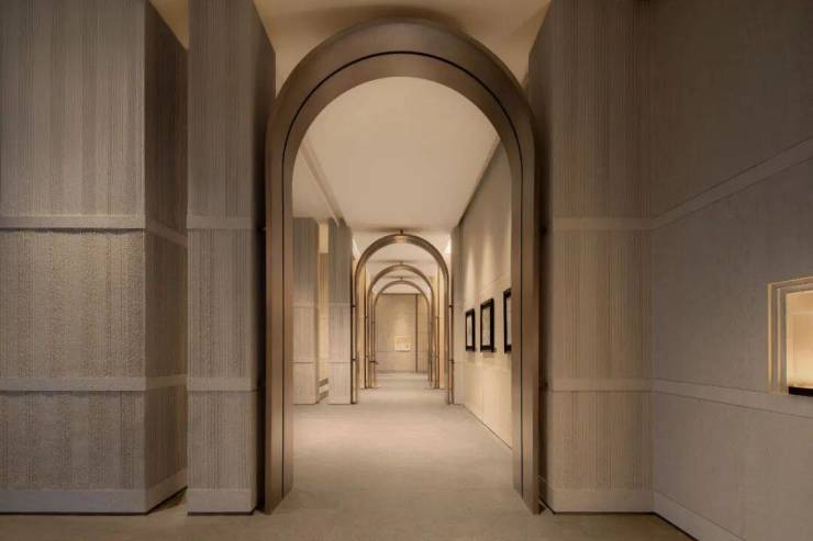 比石材更昂贵的是将其雕琢打磨成曲线的过程。从高迪的圣家堂,到尼迈耶的“混凝土曲线美学”,杭序府示范区里,大量的曲线和弧线致敬经典,让人印象深刻:会所里一道道拱门组成的框景庄重深邃,弧形穹顶则轻盈空灵;甚至每层之间的石材线条都采用了双曲面倒弧工艺,打造具有颠覆性的城市美学界面。