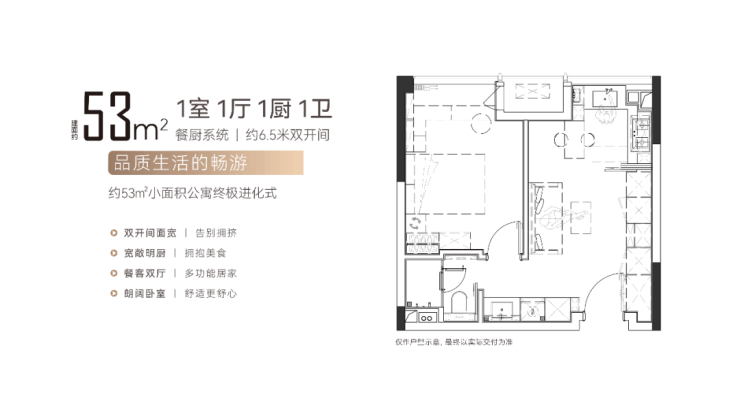 约53平的单室套,双开间大面宽,还是双厅设计,虽然面积不大,但户型方正,功能齐全。开放式的设计,空间感做的很好,装修风格也很有个性,很适合现在具有个性、对生活品质有要求的人群居住。