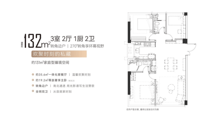 约132平的户型,做到3室2厅2卫,因为都是转角边户,采光和通风都非常好,客餐厅面积超18㎡,主卧带独立卫浴,空间感和尺度都做的很到位,完全可以满足三代同堂的居住需求。海派风情的装修,高雅艺术感十足,更是加了不少分。这个户型也是热度很高的一个户型,肯定是不愁卖。