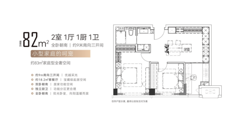 约82平的户型,是2室1厅设计,不仅全卧朝南,还做到了南向三约9米开间,具备非常优越的采光,空间的舒适度和尺度,对于一个小型家庭来说绰绰有余。整体是去客厅化的设计,空间配色基调沉稳高级且充满生活品质感。