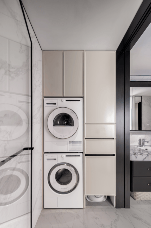 为165㎡以上户型配置 独立家政间,并全线选用 瑞典百年品牌ASKO洗烘设备,规划洗、烘、熨、藏一站式高效动线,让家务打理成为从容、优雅的日常仪式。
