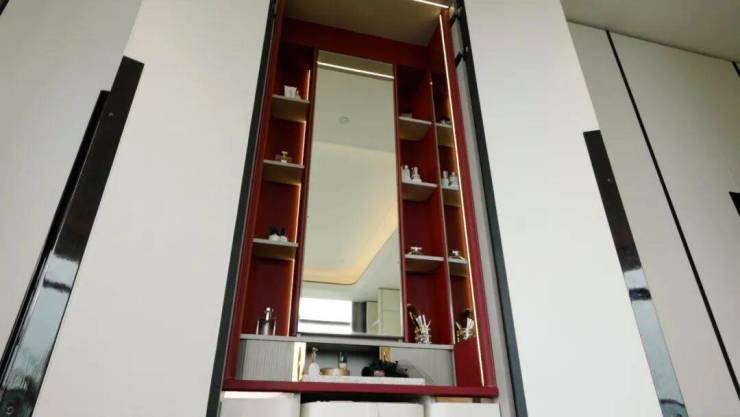 继续往上,两梯一户的奢华体验在这只是标配。优雅的艺术背板,精致的金属壁布、大面的定制雀眼木饰材,掌纹和人脸识别系统...无论是电梯轿厢还是入户电梯厅,都与项目的奢适风格保持了一致性。