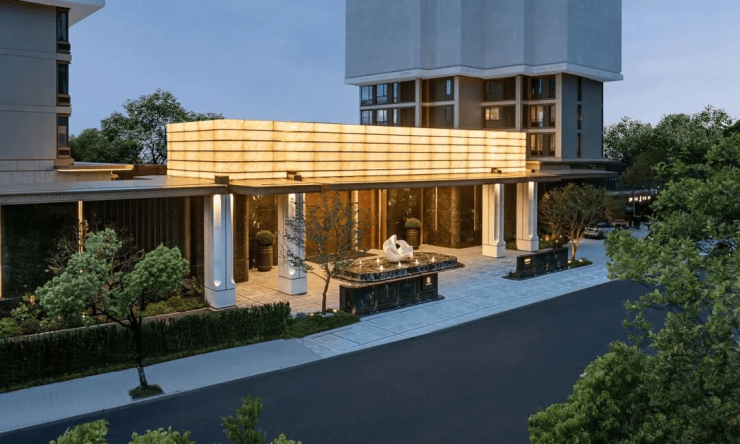 如山茶花般的定制石雕,映衬厚重的朱氏铜门,配上两侧大面荷塘月色奢石、铂金钻石材景墙,远远望去,宛如歌剧开幕时垂坠的天鹅绒帷幔,打开归家的仪式感。
