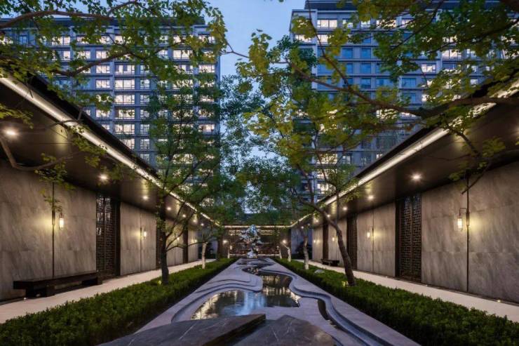 沿着林荫大道继续向前走,中央会客厅俨然是一方品茗休憩的治愈场所,两侧叠水潺潺,亭台轩榭间,甄选的乌桕林、罗汉松、太湖石等花石树木高底错落,呈现出一幅写意的山水立体画卷。
