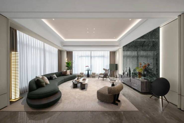 客厅背景墙用了一整面的玉翡翠,玉石的清透典雅带着远古冰川裂纹的幽深。双岛台的设计,是闺蜜下午茶的悠闲时光,美诺九件套,是爸爸带女儿下厨的鲜美飘香。三米的长茶台,茶韵悠长,十人的大圆桌,欢聚一堂。