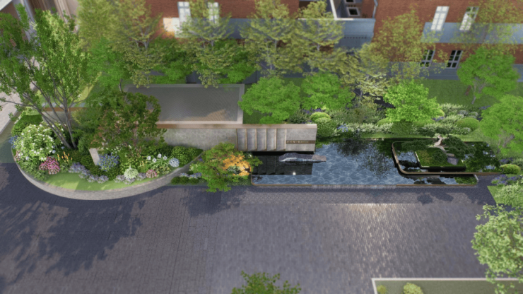 同时大门配有水钵,黑松,这样的搭配不仅视觉上效果更好,也能中和掉材料本身的冷感。