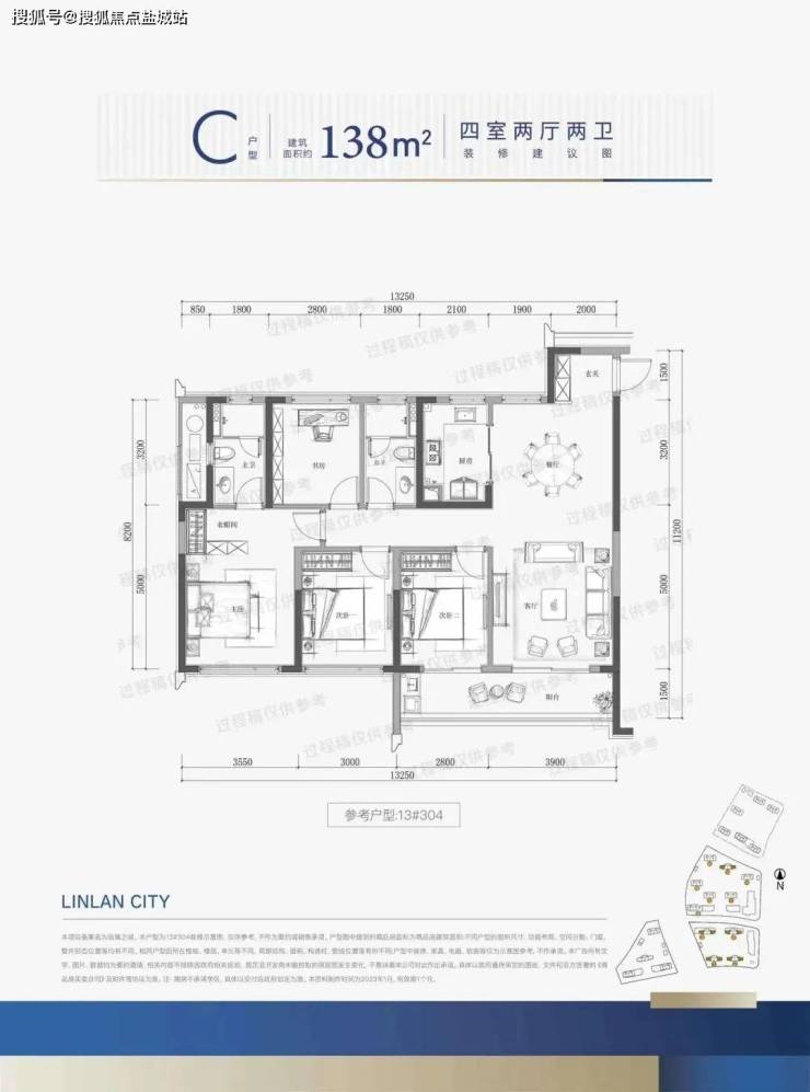 建面约138方户型:138㎡四房两厅两卫边套户型,则适合改善家庭的需求。空间格局动静分区,三个南向卧室,做到了「阳光平权」。卧室与客厅一同实现了四开间朝南,南向面宽超13米,同样也规划有双开间的「跑道阳台」。