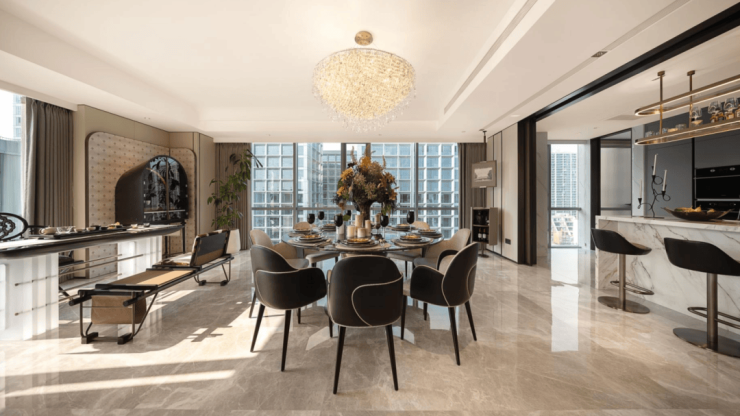 除此之外,西投银泰城|映萃更通过大师设计、空间革新与精装配置的系统性升级,将大平层生活从“居住容器”提升为“社交艺术场”。邱德光设计的【潮印】样板房以环形优雅布局与270°无界采光面,将钱塘江景引入室内,形成“景随人动”的沉浸式体验;郑仕梁执笔的「繁花316」样板间则融合海派东方美学与现代设计语言,通过王家卫电影般的戏剧性光影与复古元素,营造私密且尊贵的氛围。双IP样板间不仅成为项目流量引擎,更分别针对“商务社交”与“家族栖居”两类核心客群,实现生活场景的精准定制。